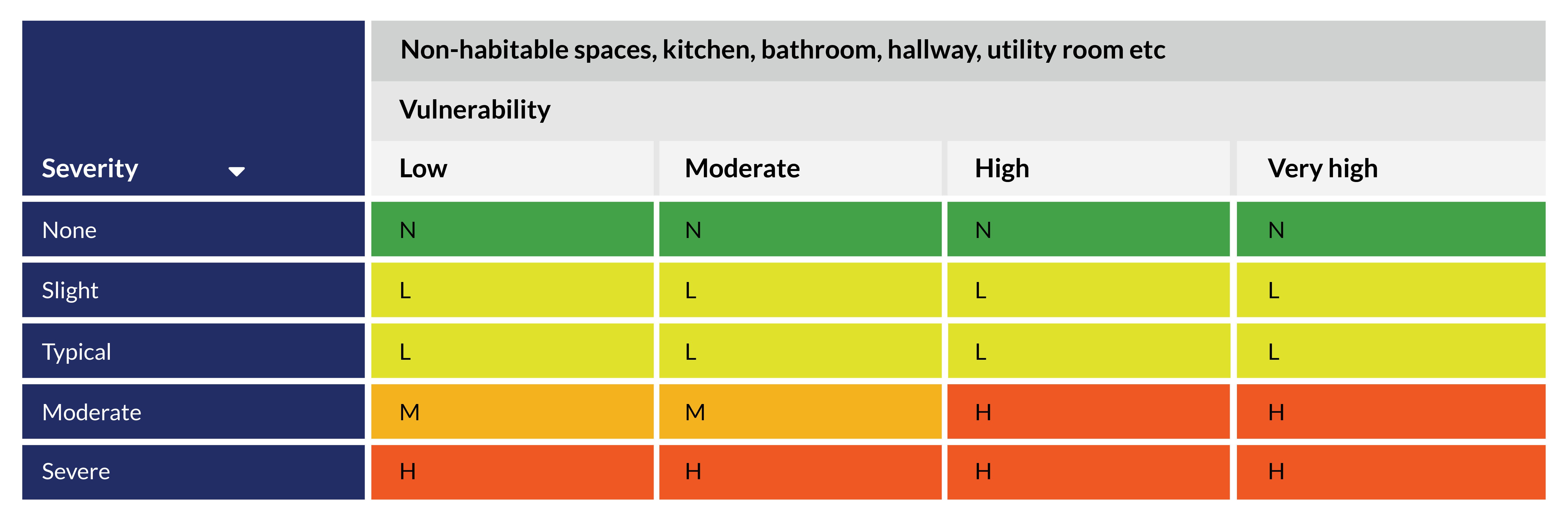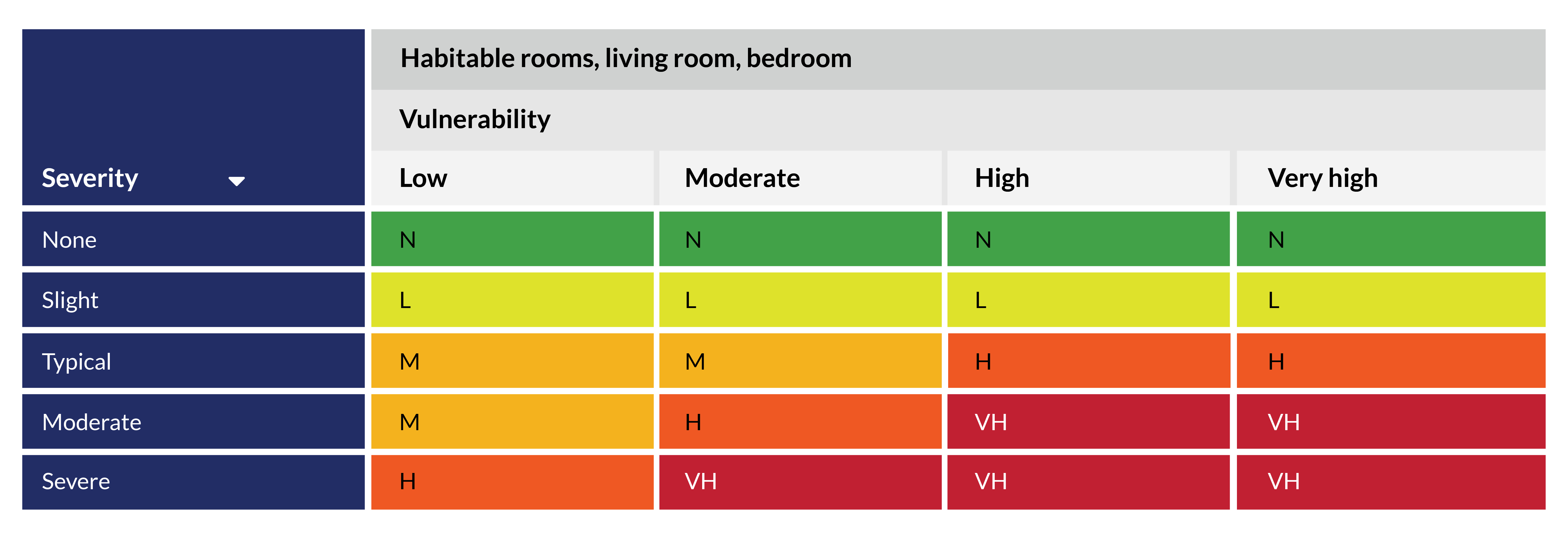 We will also take account of whether anyone in the home is more vulnerable to harm from damp or mould as well as where in the home the problems are. These factors may increase how quickly we respond and the actions we take. We use the next two assessment tables for this process.