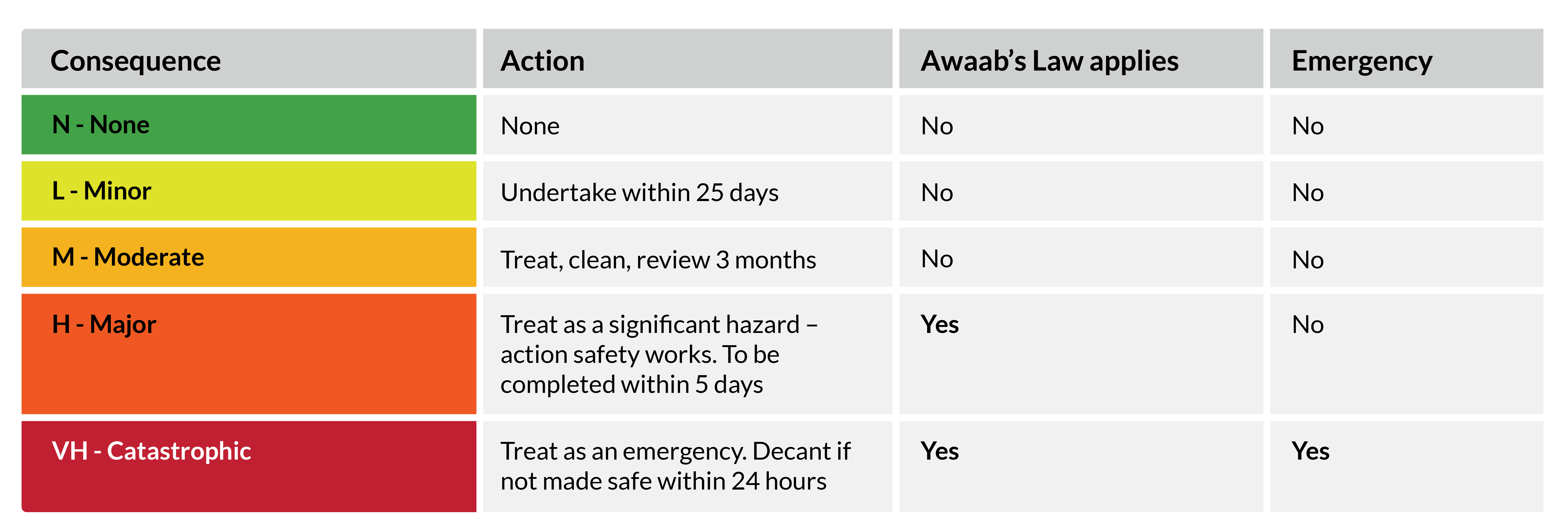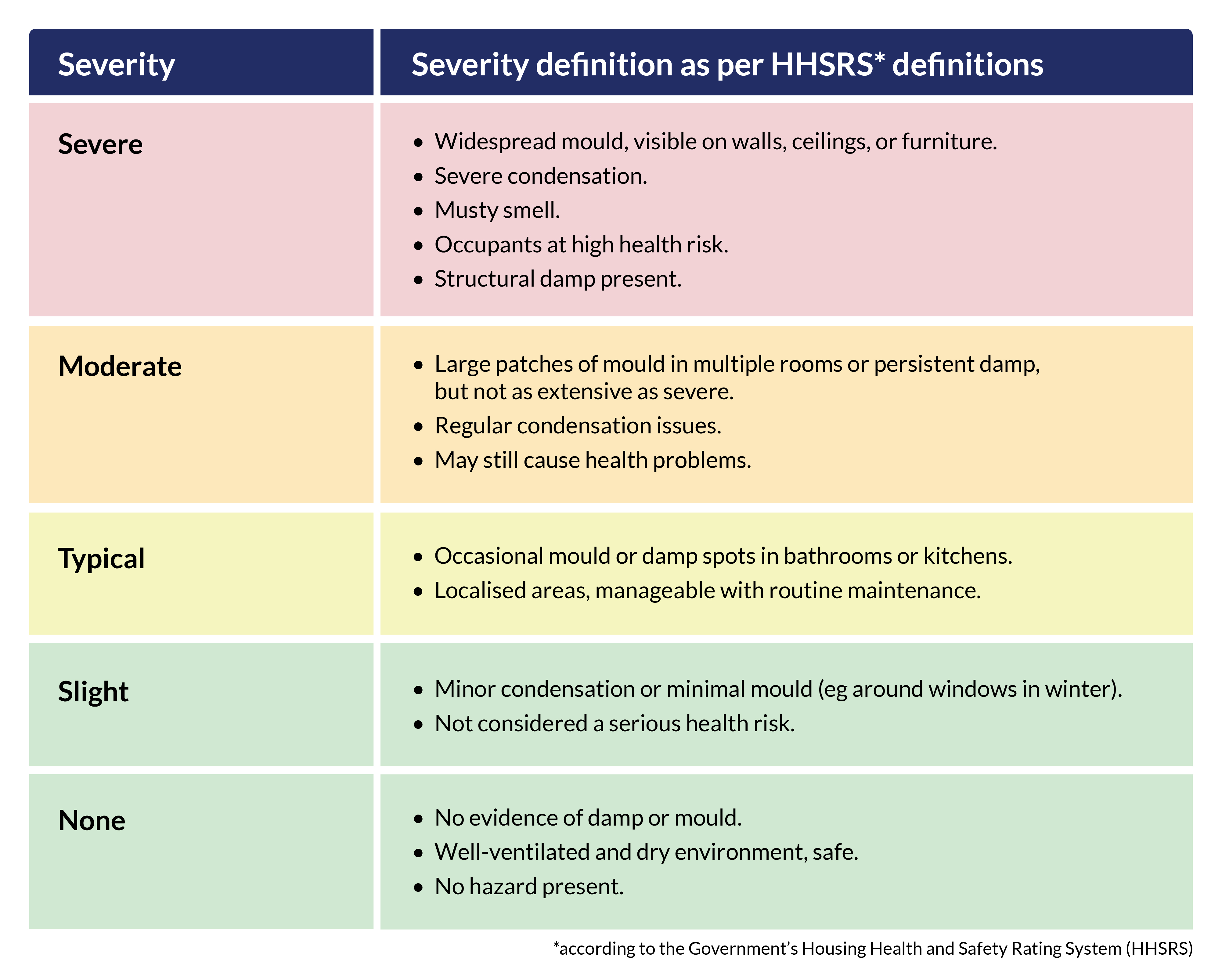 Once we have assessed how severe mould or damp is in your home and how at-risk you might be, we will base our response on the categories below:
