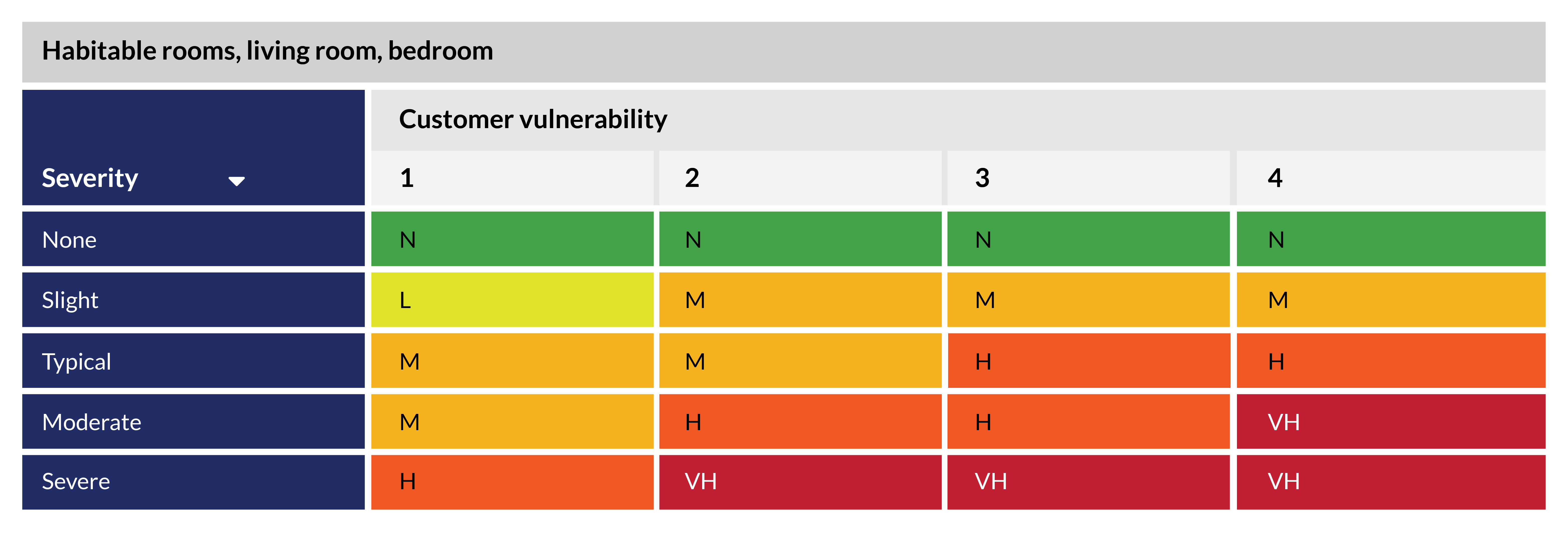 We will also take account of whether anyone in the home is more vulnerable to harm from damp or mould as well as where in the home the problems are. These factors may increase how quickly we respond and the actions we take. We use the next two assessment tables for this process.