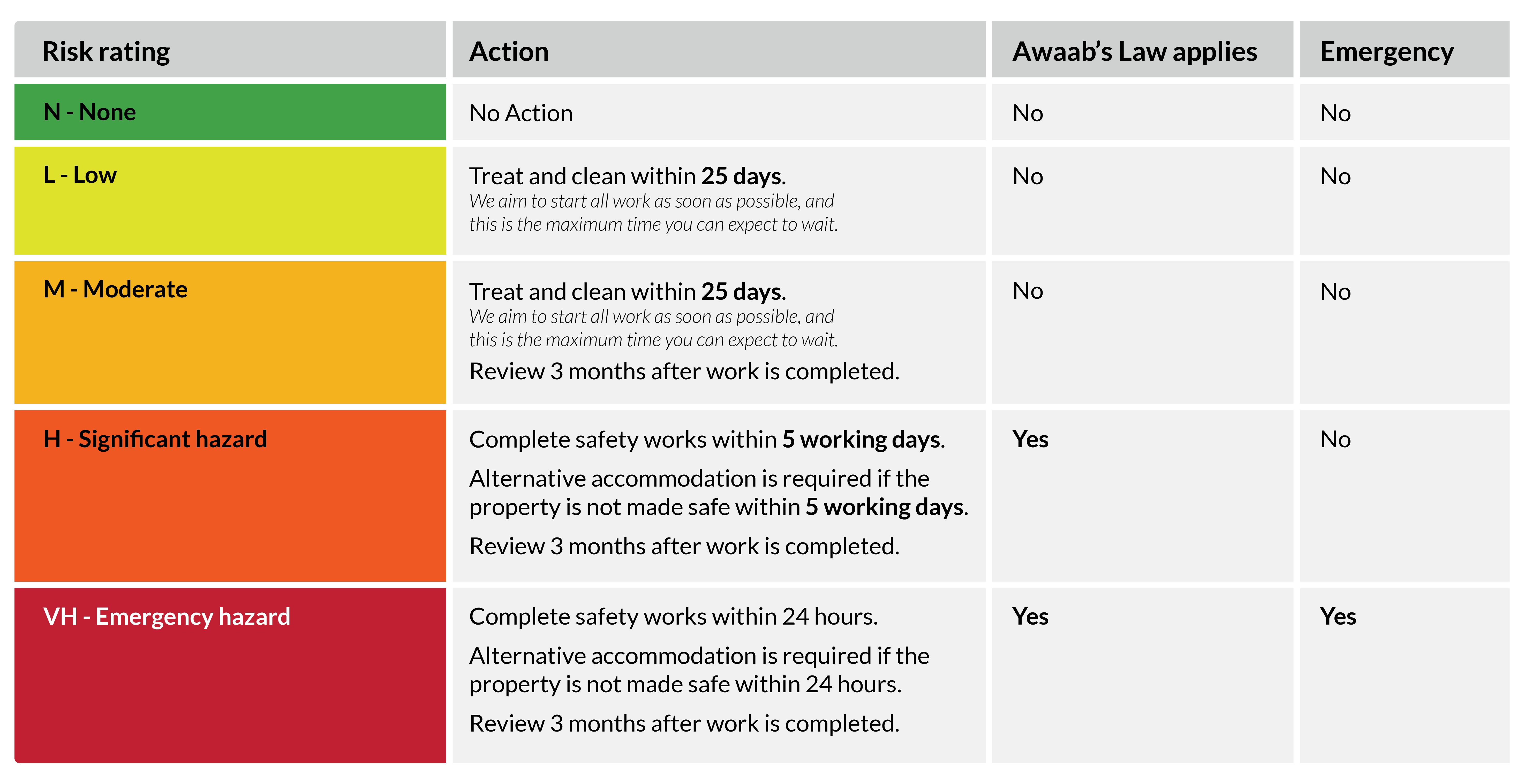 Our priority repairs service also follows new procedures and requirements set out in Awaab's Law - new legislation that comes into effect on 27 October 2025. You can find out more about this law and what it means on the Government's website.