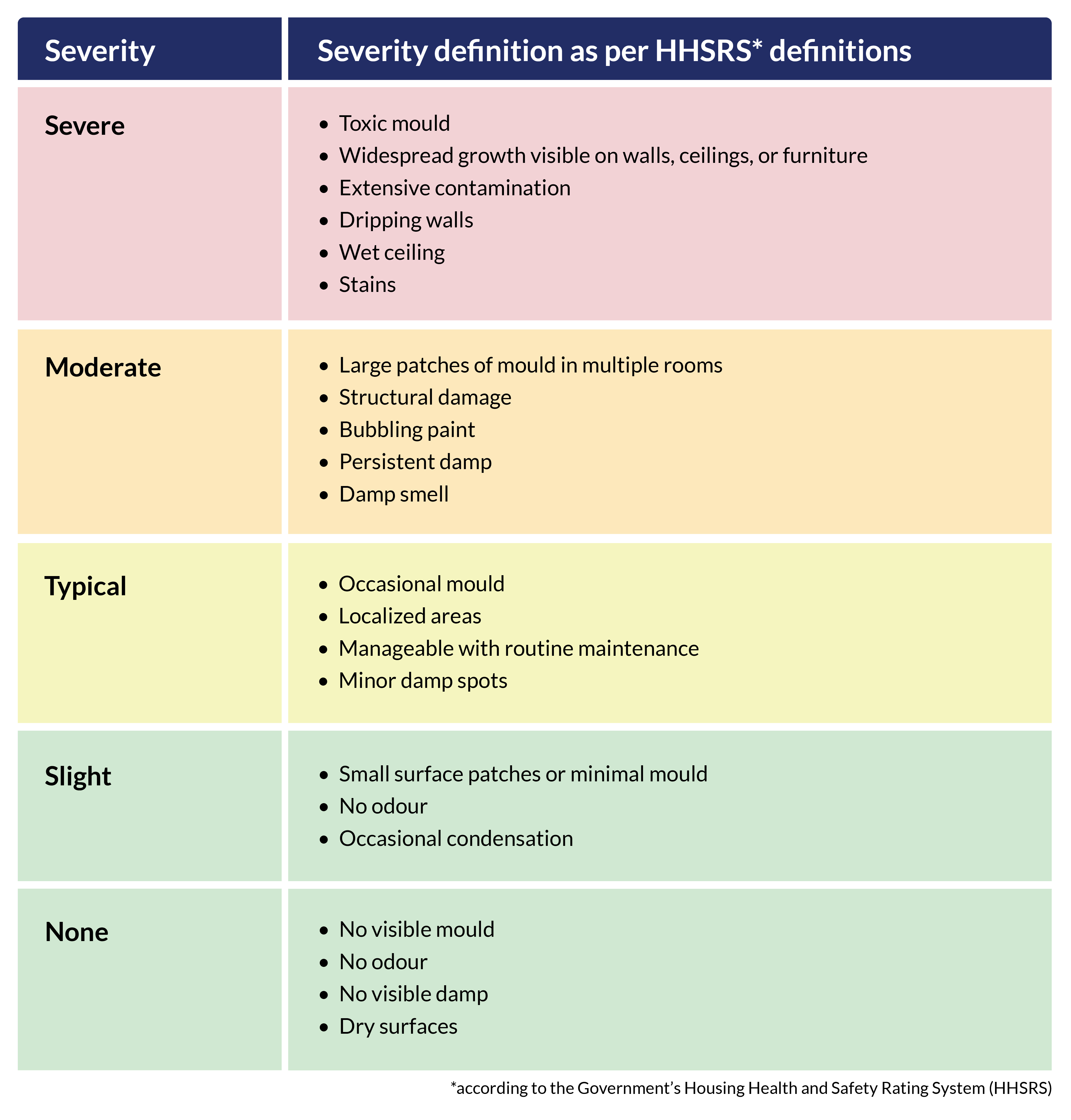 Once we have assessed how severe mould or damp is in your home and how at-risk you might be, we will base our response on the categories below: