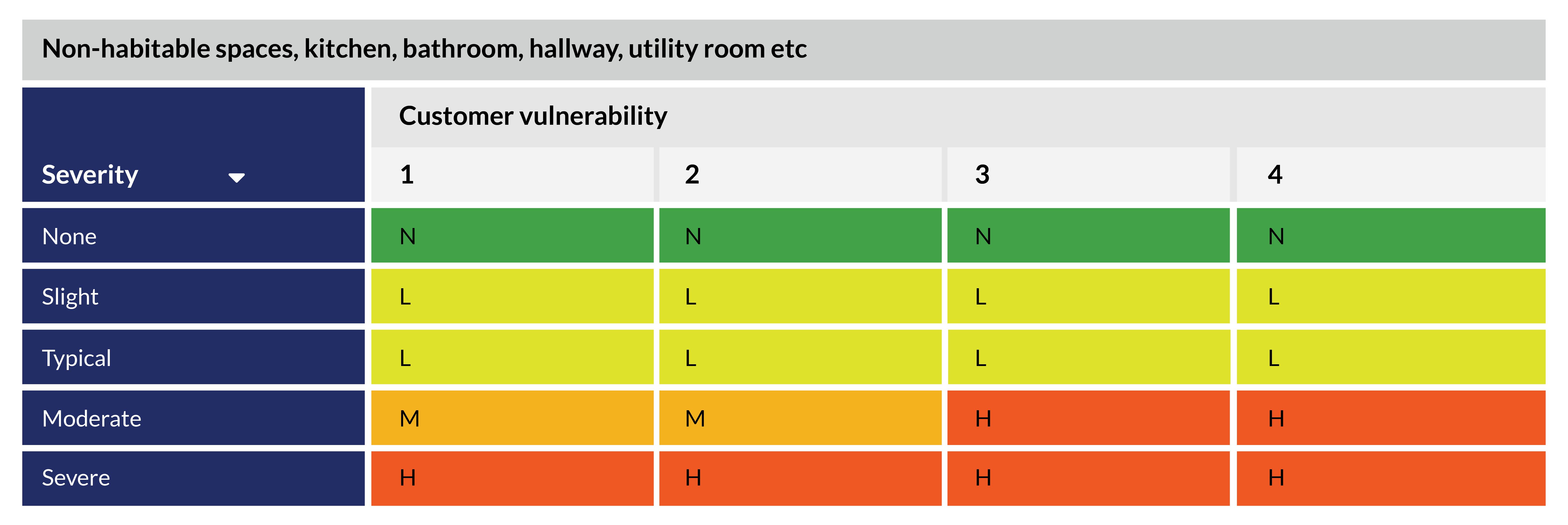 We will also take account of whether anyone in the home is more vulnerable to harm from damp or mould as well as where in the home the problems are. These factors may increase how quickly we respond and the actions we take. We use the next two assessment tables for this process.